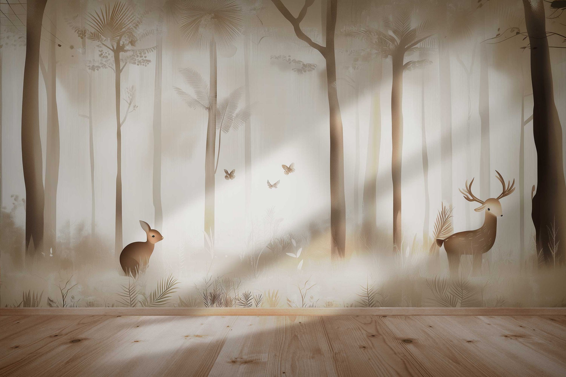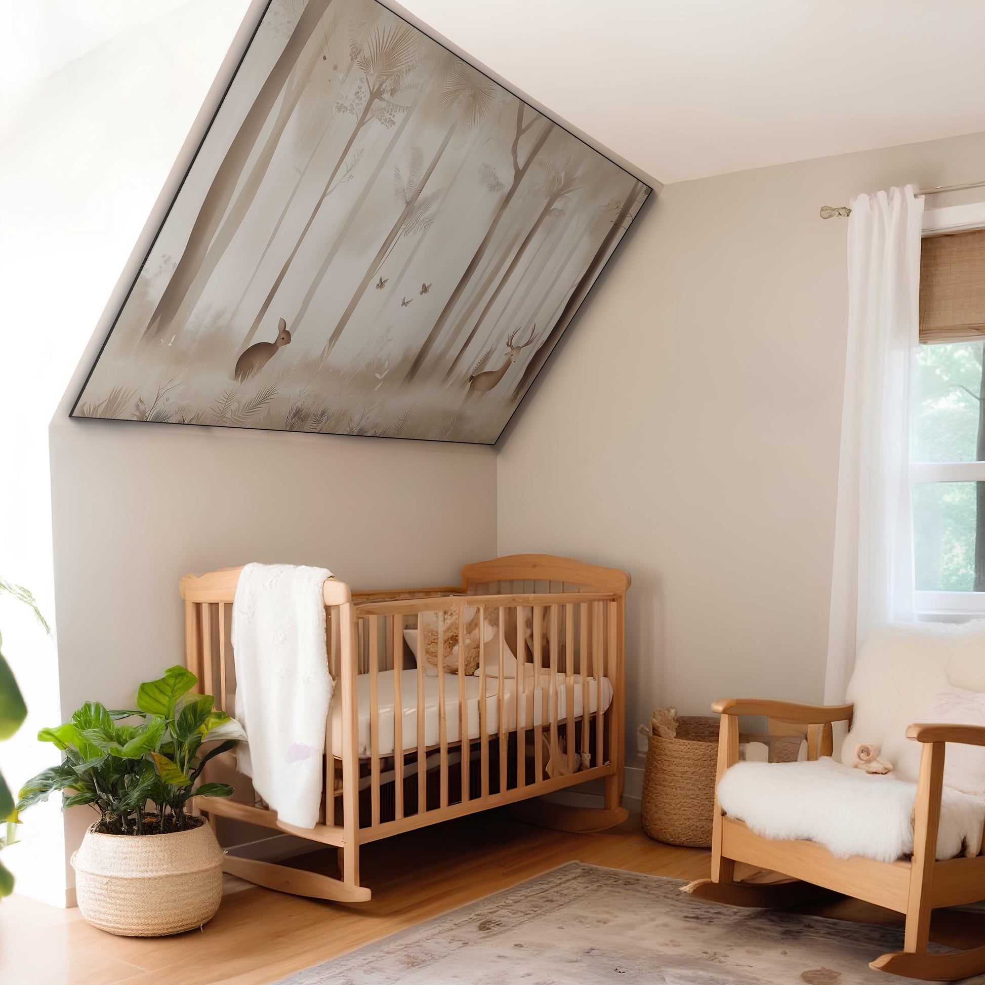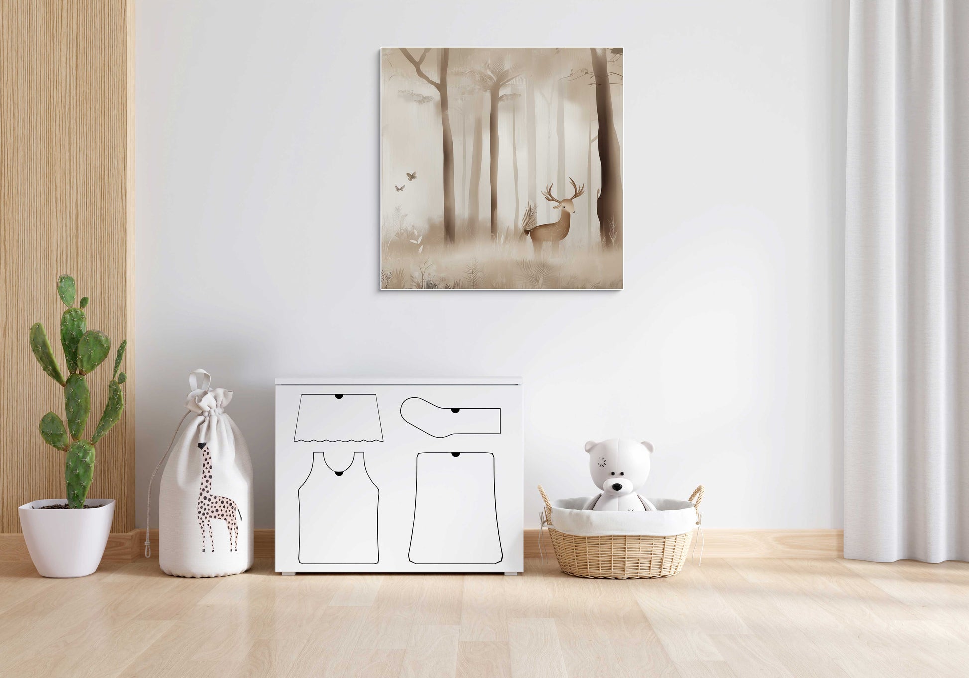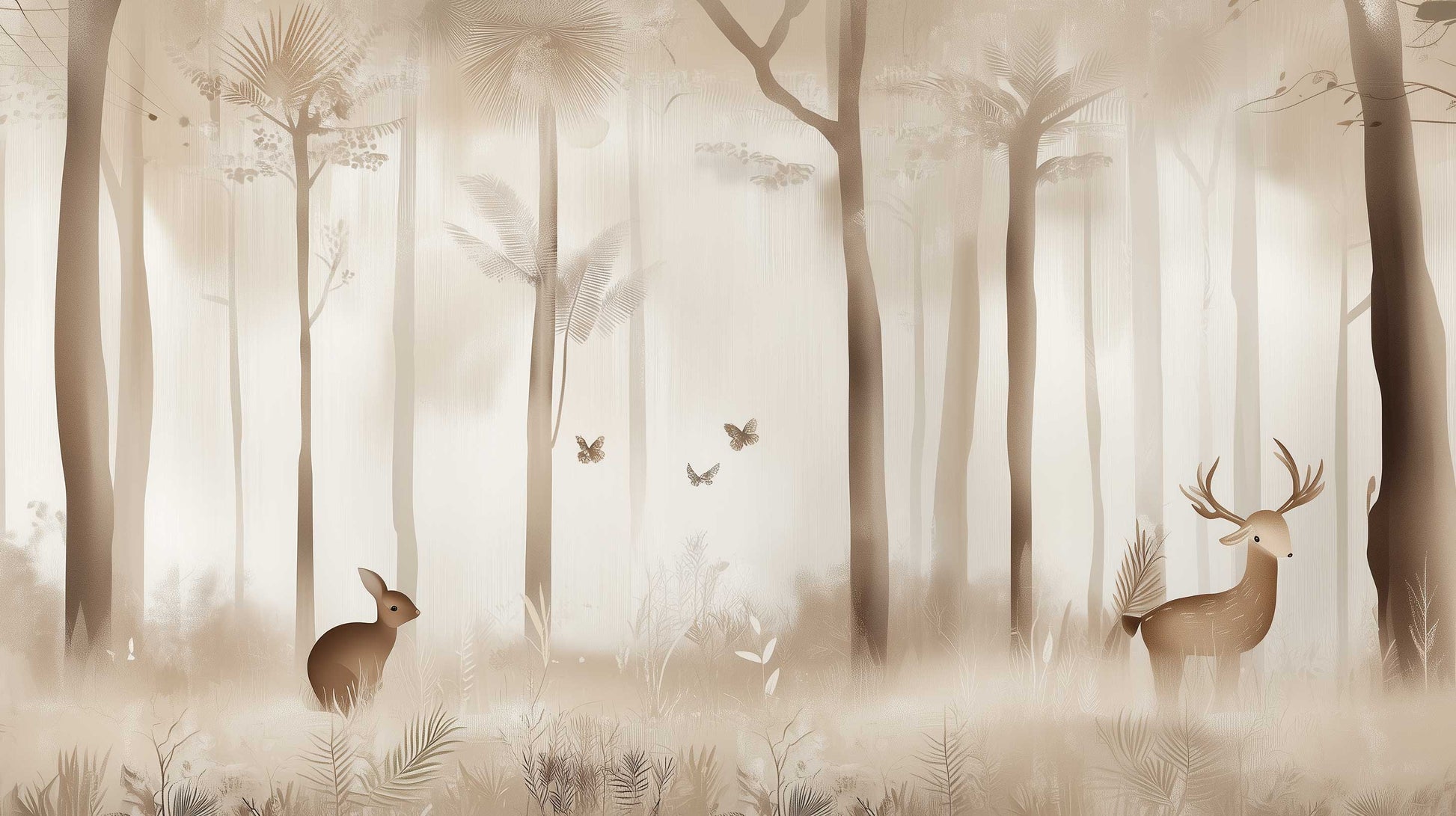 Dit WonderWandjes doek toont bomen, planten en dieren die digitaal zijn getekend, maar in een losjes geschilderde look. Alsof ze met penseel of potlood zijn ingevuld.