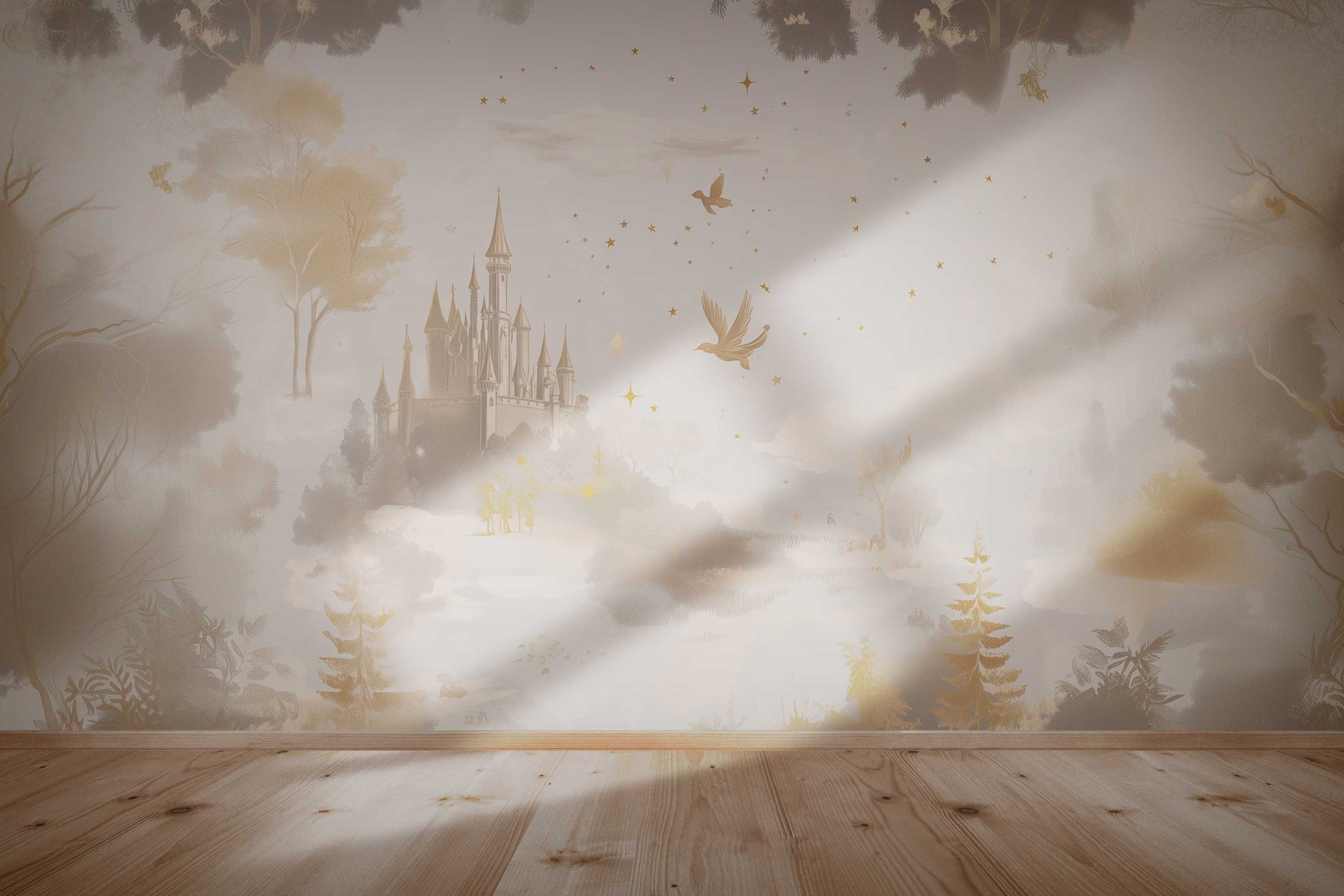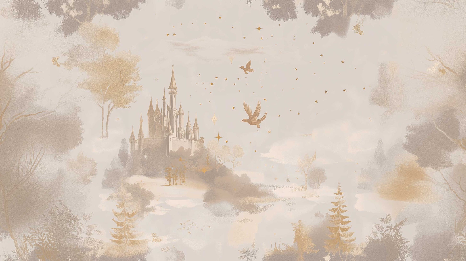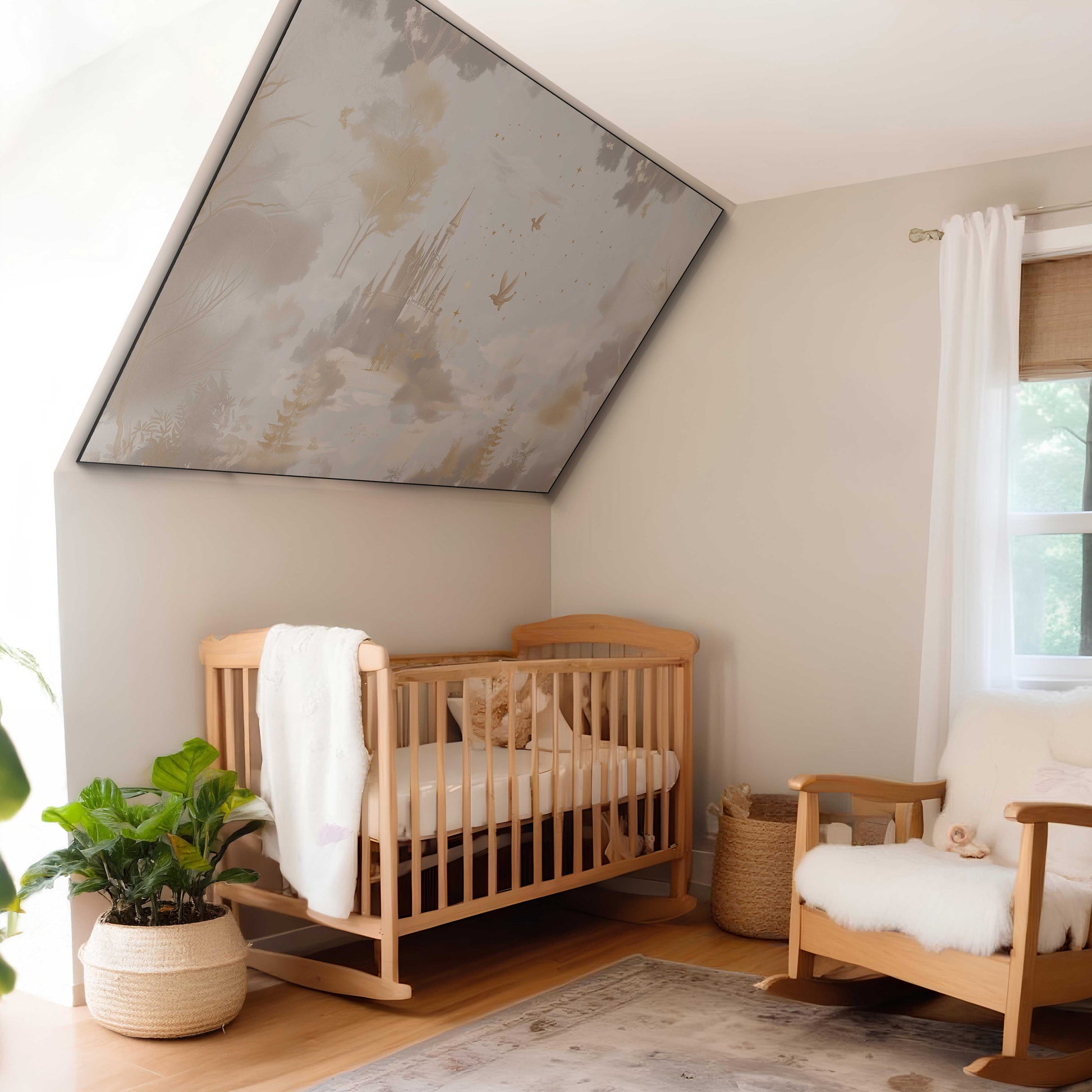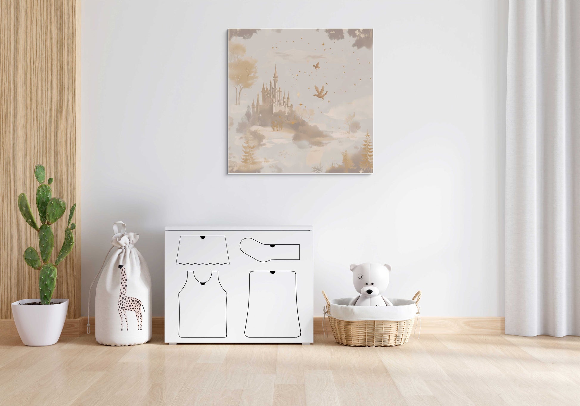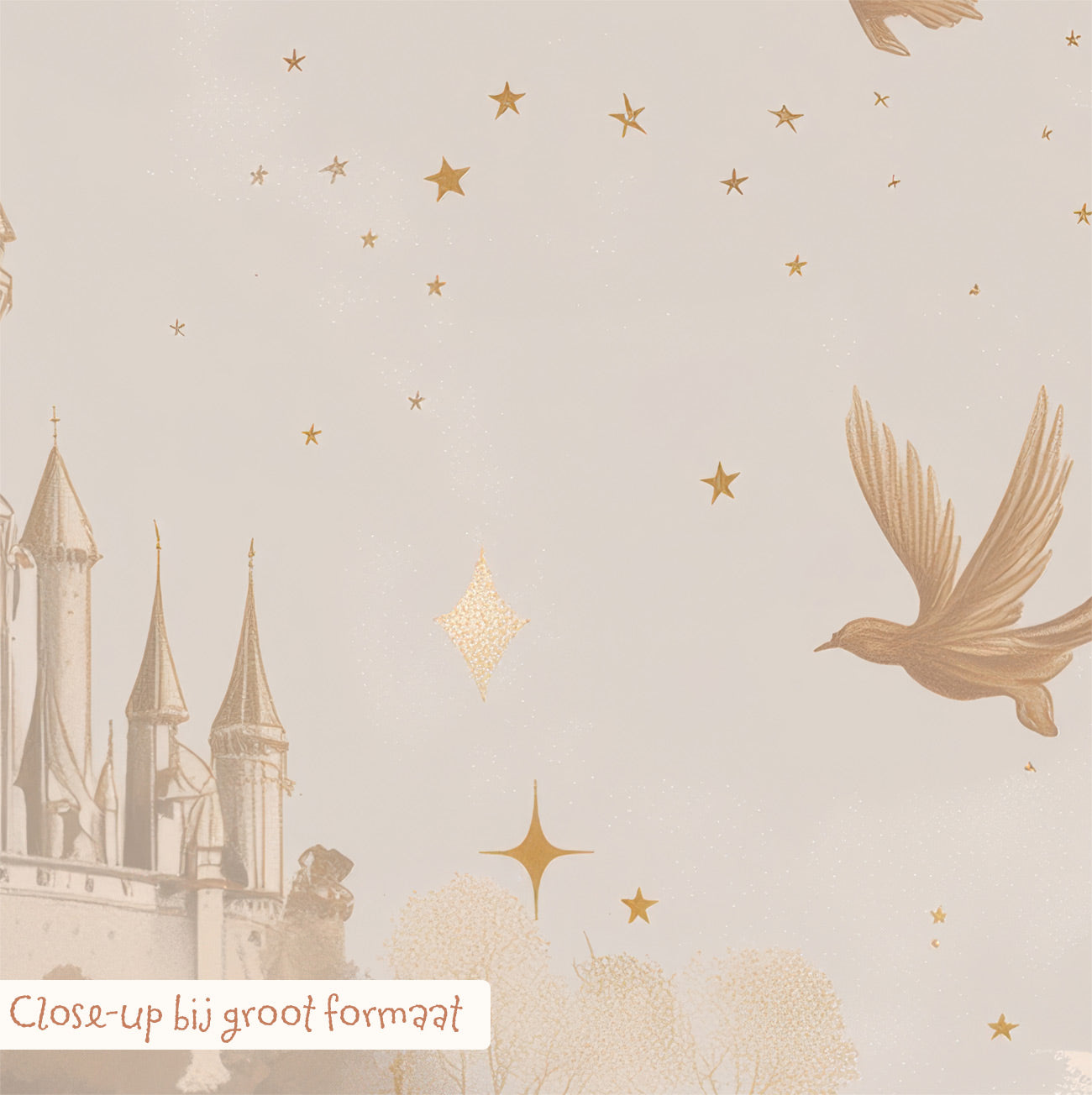 Dit WonderWandjes doek combineert een dromerige illustratiestijl met krijtachtige, poederige texturen en fijne, sprookjesachtige details.